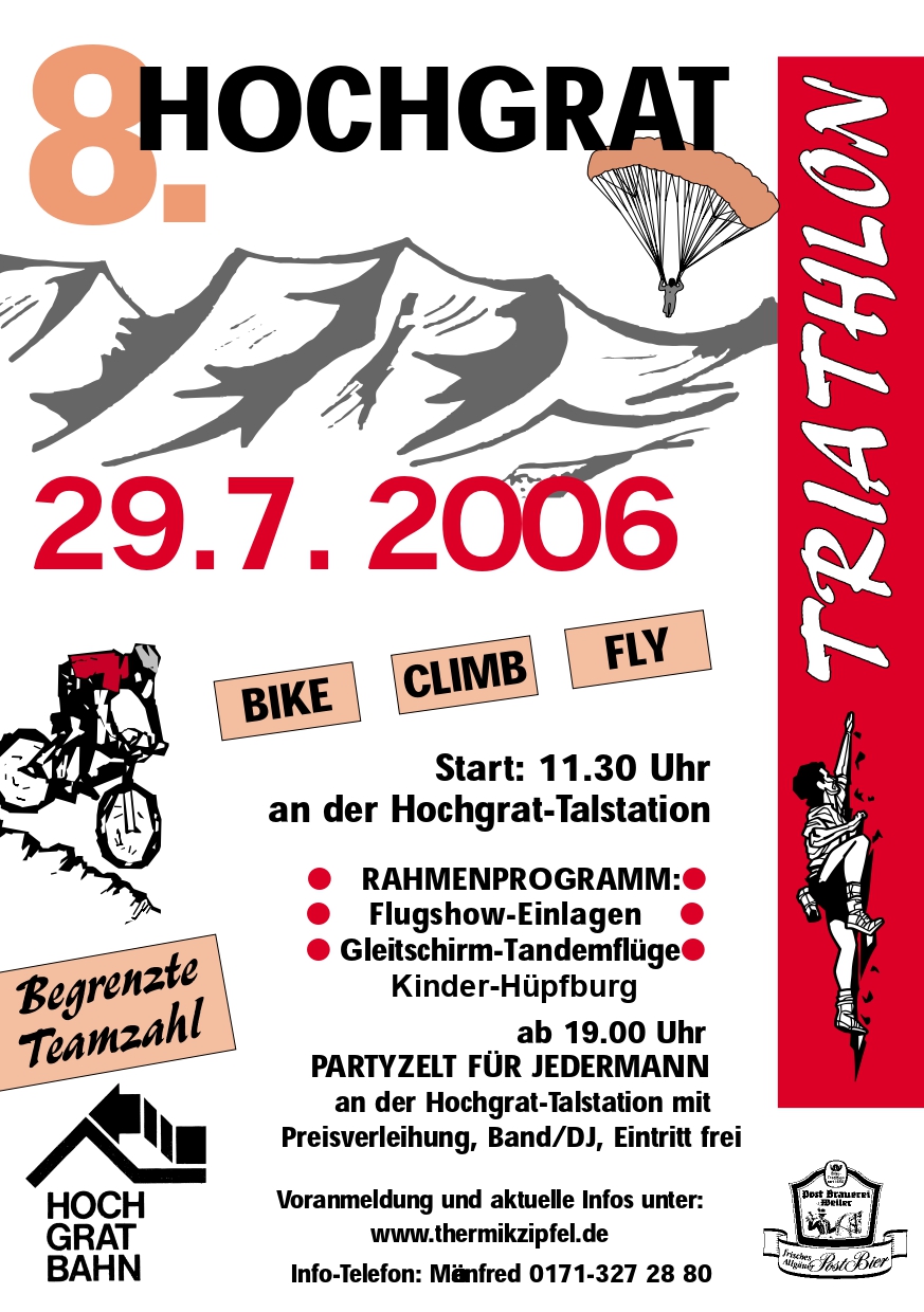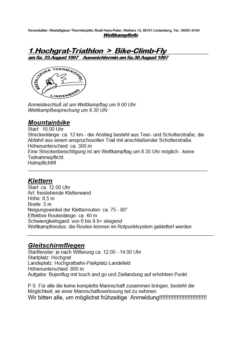 Die Idee, diese drei Sportarten in einem Wettkampf vereint im Westallgäu auszutragen, hatten die Organisatoren bereits im vergangenen Jahr. Mehrere Mannschaften aus Oberstaufen und Lindenberg kämpften in Villnöss (Südtirol) gegen eine internationale Konkurrenz. Angetrieben von der Begeisterung aller Teilnehmer und Zuschauer in Südtirol führt das Westallgäuer Team einen solchen Triathlon nun am Samstag den 23.08.1997 am Hochgrat durch (Ausweichtermin: 30.08.97).